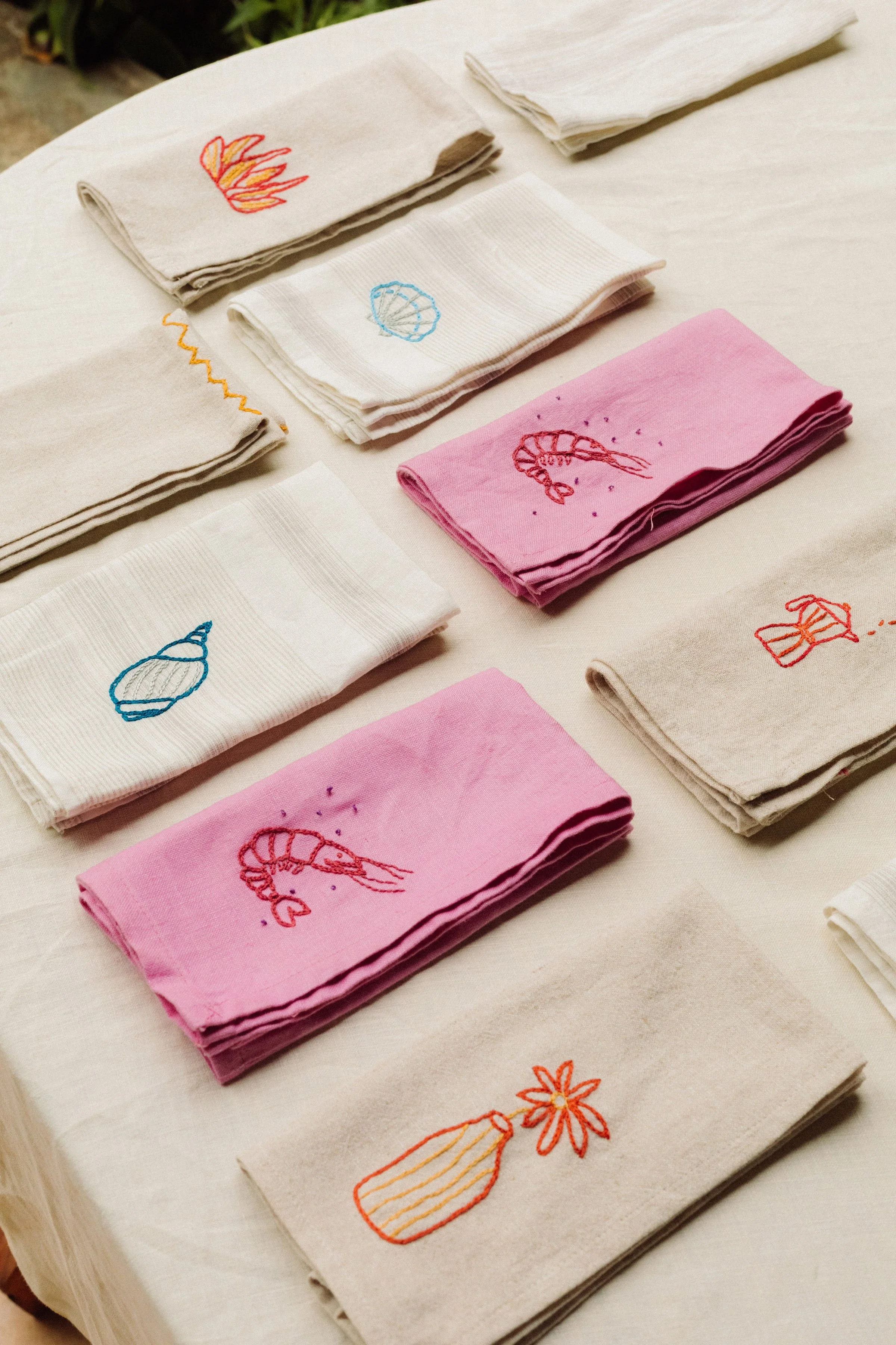 We create upcycled napkins from carefully sourced secondhand materials, giving new life to forgotten textiles. Sometimes it’s a linen skirt, a shirt, or a large tablecloth — each piece is thoughtfully chosen and transformed. With attention to detail and creativity, we turn these finds into unique, elevated napkins, each one carrying its own story.